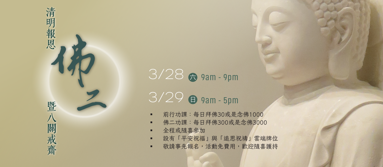 【道場公告】 《福田班》進行的日期(4/5, 5/3, 7/12, 8/1, 9/13, 10/4, 11/1, 12/13, 2027/1/24),舊金山道場(Fremont)將暫停參訪。 聖嚴法師《108自在語》 1. 需要的不多,想要的太多。 2. 知恩報恩為先,利人便是利己。 3. 盡心盡力第一,不爭你我多少。 4. 慈悲沒有敵人,智慧不起煩惱。 5. 忙人時間最多,勤勞健康最好。 6. 布施的人有福,行善的人快樂。 7. 心量要大,自我要小。 8. 要能放下,才能提起。提放自如,是自在人。 9. 識人識已識進退,時時身心平安; 知福惜福多培福,處處廣結善緣。 10. 提得起放得下,年年吉祥如意; 用智慧種福田,日日都是好日。 11. 身心常放鬆,逢人面帶笑; 放鬆能使我們身心健康,帶笑容易增進彼此友誼。 12. 話到口邊想一想,講話之前慢半拍。 不是不說,而是要惜言慎語。 13. 在生活中,不妨養成:「能有,很好;沒有,也沒關係」的想法, 便能轉苦為樂,便會比較自在了。 14. 四安:安心、安身、安家、安業。 15. 四要:需要、想要、能要、該要。 16. 四感:感恩、感謝、感化、感動。 17. 四它:面對它、接受它、處理它、放下它。 18. 四福:知福、惜福、培福、種福。 19. 能要、該要的才要;不能要,不該要的絕對不要。 20. 感恩能使我們成長,報恩能助我們成就。 21. 感謝給我們機會,順境、逆境,皆是恩人。 22. 遇到好事,要隨喜、讚嘆、鼓勵,並且虛心學習。 23. 少批評、多讚美,是避免造口業的好方法。 24. 平常心就是最自在、最愉快的心。 25. 踏實地走一步路,勝過說一百句空洞的漂亮語。 26. 知道自己的缺點愈多,成長的速度愈快,對自己的信心也就愈堅定。 27. 多聽多看少說話,快手快腳慢用錢。 28. 唯有體驗了艱苦的境遇,才會有精進奮發的心。 29. 踏踏實實做人,心胸要廣大;穩穩當當做事,著眼宜深遠。 30. 忙而不亂,累而不疲。 31. 忙得快樂,累得歡喜。 32. 「忙」沒關係,不「煩」就好。 33. 工作要趕不要急,身心要鬆不要緊。 34. 應該忙中有序的趕工作,不要緊張兮兮的搶時間。 35. 不要以富貴貧賤論成敗得失,只要能盡心盡力來自利利人。 36. 任勞者必堪任怨,任事者必遭批評。怨言之下有慈忍,批評之中藏金玉。 37. 隨遇而安,隨緣奉獻。 38. 成功的三部曲是:隨順因緣、把握因緣、創造因緣。 39. 見有機緣宜把握,沒有機緣要營造,機緣未熟不強求。 40. 人生的起起落落,都是成長的經驗。 41. 用智慧處理事,以慈悲關懷人。 42. 以智慧時時修正偏差,以慈悲處處給人方便。 43. 慈悲心愈重,智慧愈高,煩惱也就愈少。 44. 面對許多的情況,只管用智慧處理事,以慈悲對待人, 而不擔心自己的利害得失,就不會有煩惱了。 45. 心隨境轉是凡夫;境隨心轉是聖賢。 46. 大鴨游出大路,小鴨游出小路,不游就沒有路。 47. 山不轉路轉,路不轉人轉,人不轉心轉。 48. 「精進」不等於拼命,而是努力不懈。 49. 船過水無痕,鳥飛不留影,成敗得失都不會引起心情的波動, 那就是自在解脫的大智慧。 50. 給人方便等於給自己方便。 51. 甘願吃明虧,是仁者;受辱吃暗虧,是愚蠢。 52. 壓力通常來自對身外事物過於在意,同時也過於在意他人的評斷。 53. 用感恩的人、用報恩的心,來做服務的工作,便不會感到倦怠與疲累。 54. 隨時隨地心存感激,以財力、體力、智慧、心力、來做一切的奉獻。 55. 生命的意義是為了服務,生活的價值是為了奉獻。 56. 人生的目標,是來受報、還願、發願的。 57. 人的價值,不在壽命的長短,而在貢獻的大小。 58. 過去已成虛幻,未來尚是夢想,把握現在最重要。 59. 不用牽掛過去,不必擔心未來,踏實於現在,就與過去和未來同在。 60. 智慧,不是知識、不是經驗、不是思辯,而是超越自我中心的態度。 61. 積極人生,謙虛滿分;自我愈大,不安愈多。 62. 上等人安心於道,中等人安心於事,下等人安心於名利物欲。 63. 你是有那些身分的人,就應該做那些身分的事。 64. 在安定和諧中、把握精彩的今天,走出新鮮的明天。 65. 擔心,是多餘的折磨;用心,是安全的動力。 66. 財富如流水,佈施如挖井。井愈深,水愈多;佈施的愈多,財富則愈大。 67. 面對生活,要有「最好的準備,最壞的打算」。 68. 只要還有一口呼吸在,就有無限的希望,就是最大的財富。 69. 救苦救難的是菩薩,受苦受難的是大菩薩。 70. 超越生老病苦三原則:活得快樂、病得健康、老得有希望。 71. 超越死亡三原則:不要尋死、不要怕死、不要等死。 72. 死亡不是喜事,也不是喪事,而是一件莊嚴的佛事。 73. 每一個孩子,都是幫助父母成長的小菩薩。 74. 對青少年,要關心不要擔心,要誘導不要控制,用商量不用權威。 75. 愛你的孩子,與其擔心,不如祝福吧! 76. 夫妻是倫理的關係,不是「論理」的關係。 77. 能不亂丟垃圾,隨時清撿垃圾,都是做的功德。 78. 眼光,是你的智慧;運氣,是你的福德。 79. 喜愛的就想佔有,討厭的就會排斥,患得患失,煩惱就來了。 80. 經常少欲知足的人,才是無虞匱乏的富人。 81. 心不平安是真正的苦,身體的病痛不一定是苦。 82. 明知心不平安是苦事,就趕快以持念「南無觀世音菩薩」來安心吧! 83. 現在擁有的,就是最好的。擁有再多也無法滿足,就等於是窮人。 84. 不要用壓抑來控制情緒,最好用觀想、用佛號、用祈禱,來化解情緒。 85. 好話大家說,好事大家做,好運大家轉。 86. 大家說好話,大家做好事,大家轉好運。 87. 每人每天多說一句好語,多做一件好事,所有小小的好,就會成為一個大大的好。 88. 急