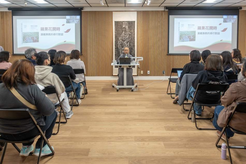 初春的三月,法鼓山矽谷中心邀請法鼓山信眾教育院監院果毅法師與普化中心信眾教育課務室室主常遂法師前來介紹《蘋果花開時──漢藏佛教的修行對話》一書,分享十位比丘尼法師前往美國西雅圖內陸舍衛精舍(Sravasti Abbey)參訪學習的歷程。