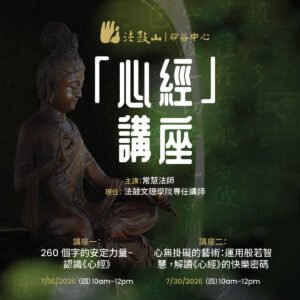 課程講座 類別 課程講座 地點 法鼓山矽谷中心 法鼓山舊金山道場 線上 語言 以中文進行 以英文進行 以英文進行 以雙語進行 4 月 2026 聆聽——打開親子對話之門/英文Repeating Event Do you sometimes fee […] 4 月 25 pm 1:30 - pm 3:30 法鼓山舊金山道場 平安最幸福-心靈環保讀書會Repeating Event 在瞬息萬變的網路資訊、媒體社交訊息充塞時 […] 4 月 28 am 10:00 - pm 12:00 法鼓山矽谷中心 讀書會/英文Repeating Event Joining a book club […] 4 月 28 pm 7:30 - pm 9:00 法鼓山舊金山道場 5 月 2026 聖嚴書院:福田班Repeating Event 【日期】2026/03/01, 04/0 […] 5 月 03 am 9:30 - pm 5:00 法鼓山舊金山道場 修行在紅塵-心靈環保讀書會Repeating Event – 實體 + 線上心靈環保讀 […] 5 月 06 am 10:00 - am 11:45 法鼓山舊金山道場 四聖諦與六度 – 常襄法師主講/英文Repeating Event In this serie […] 5 月 09 am 11:15 - pm 12:00 法鼓山舊金山道場 法鼓全集第六輯:自傳、遊記類 — 心靈環保讀書會Repeating Event 透過閱讀法鼓全集第六輯自傳、遊記類下的1 […] 5 月 19 am 10:00 - am 11:30 法鼓山矽谷中心 7 月 2026 法鼓山矽谷中心「心經」講座系列Repeating Event ——常慧法師(法鼓文理學院專任講師)主講 […] 7 月 16 am 10:00 - pm 12:00 法鼓山矽谷中心 No event found!
