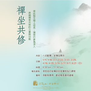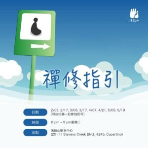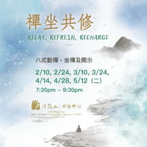 矽谷中心 - 禪修 類別 禪修 地點 法鼓山矽谷中心 線上 語言 以中文進行 以英文進行 以雙語進行 2 月 2026 禪門三炷香Daily 聖嚴法師:「禪修,是認識自己、轉化自己的 […] 2 月 01 5:30 am - 10:00 pm 線上 禪坐共修/週日Repeating Event 透過禪眾共修的力量與功能,彼此相互增上成 […] 2 月 01 9:30 am - 11:40 am 法鼓山矽谷中心 禪修指引/常住法師帶領Repeating Event 忙碌生活中,安頓心靈放輕鬆! 誠邀您來體 […] 2 月 03 8:00 pm - 9:00 pm 法鼓山矽谷中心 禪坐引導 / 英文Weekly Thursday Night Medit […] 2 月 05 8:10 pm - 10:00 pm 線上 禪坐共修 / 英文Repeating Event Date: 1/10, 1/17, 2/ […] 2 月 07 9:30 am - 11:40 am 法鼓山矽谷中心 禪坐共修/週二Repeating Event 忙碌的工作、煩瑣的事務、大量的資訊、快速 […] 2 月 10 7:30 pm - 9:30 pm 法鼓山矽谷中心 3 月 2026 初級禪訓班 — 四堂課Repeating Event 學禪,就從這裡開始 ! 嚮往雲淡風輕的日 […] 3 月 04 7:30 pm - 9:30 pm 法鼓山矽谷中心 禪修指引/英文 Beginner’s Gui […] 3 月 07 1:30 pm - 4:30 pm 法鼓山矽谷中心 4 月 2026 禪坐共修/英文Repeating Event Date: 4/11, 4/25, 5/ […] 4 月 11 9:30 am - 11:40 am 法鼓山矽谷中心 5 月 2026 禪修指引/英文 Beginner’s Gui […] 5 月 30 1:30 pm - 4:30 pm 法鼓山矽谷中心 No event found!